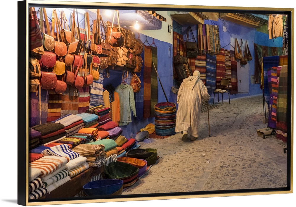 <p>Africa, Morocco. An elderly man walks past tourist shops along a street in the blue city of Chefchaouen.</p>
