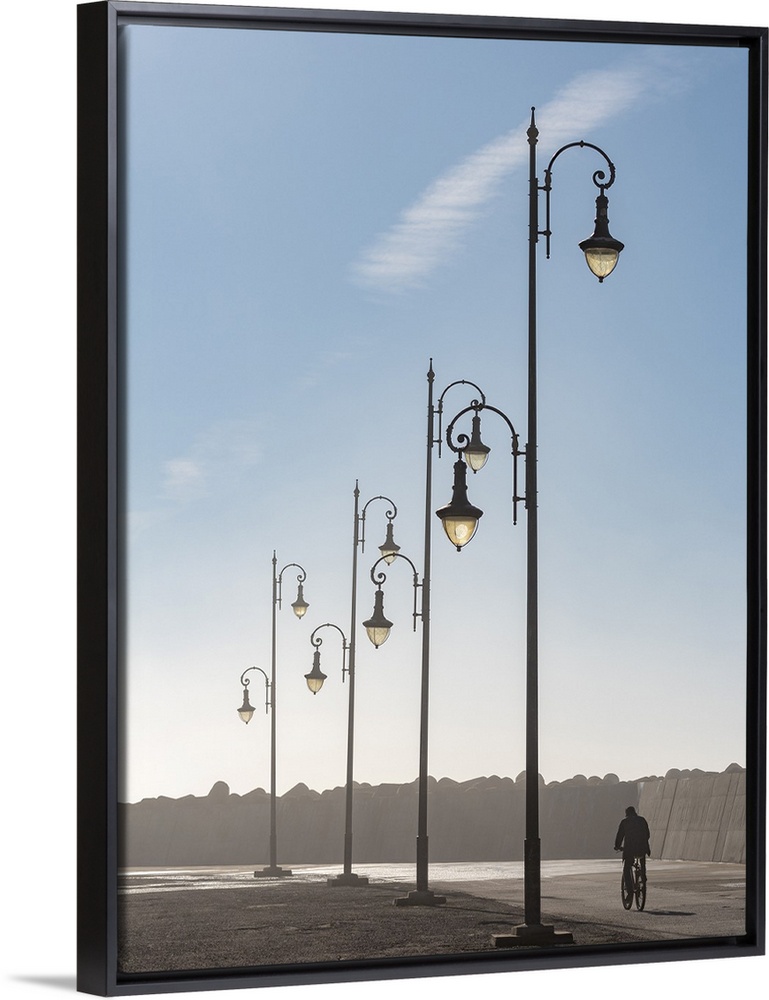 <p>Africa, Morocco, Asilah. Man rides bike past lampposts. Credit: Bill Young</p>