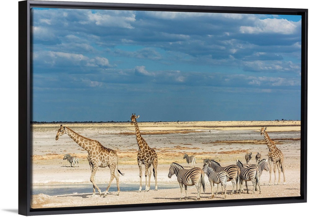 <p>Africa, Namibia, Etosha National park. Zebra herd and giraffes at a waterhole.</p>
