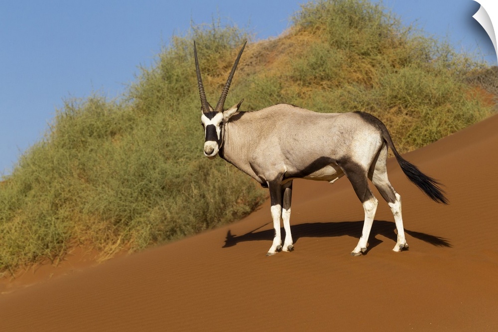 <p>Africa, Namibia, Namib Desert, Namib-Naukluft National Park, Sossusvlei, gemsbok or Oryx (Oryx gazella). An oryx standing on red sand in front of desert vegetation.</p>