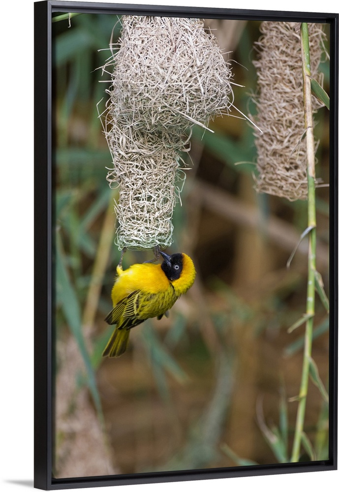 <p>Africa, Namibia, Northwestern Namibia, Kaokoveld Conservation Area, Kunene River. Male masked weaver (Ploceus velatus) building a nest along the Kunene River.</p>