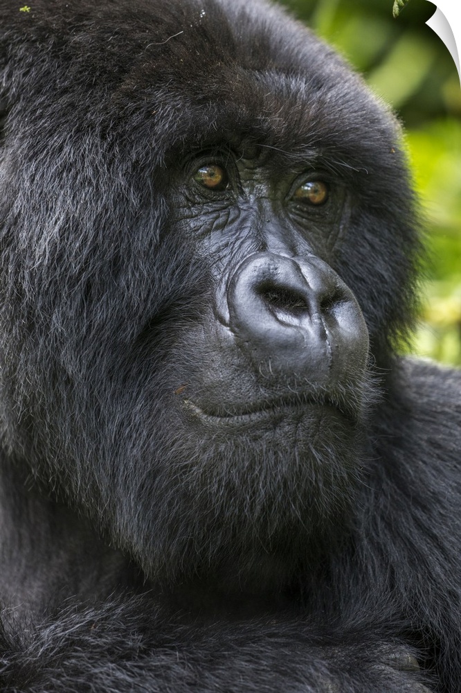 <p>Africa, Rwanda, volcanoes national park, close-up portrait of adult male mountain gorilla (Gorilla Beringei Beringei) in rainforest in Virunga mountains.</p>