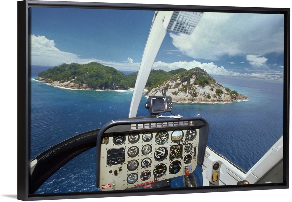 <p>Africa, Seychelles, North Island, Tropical island seen from cockpit of helicopter flying towards the island, control screens in foreground</p>