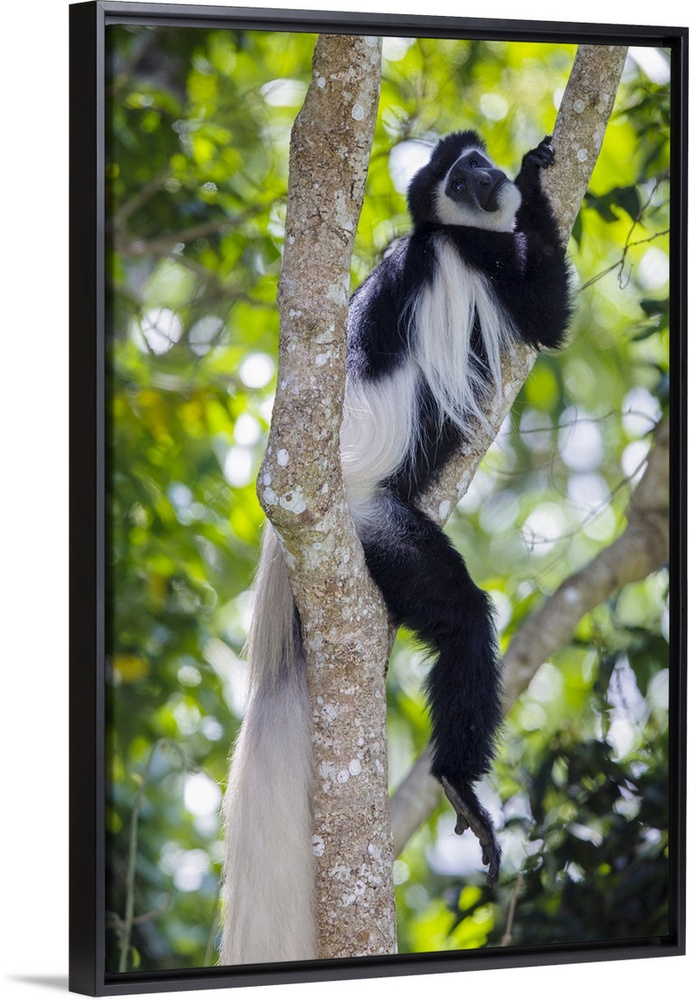 <p>Africa. Tanzania. Black and White Colobus, also known as mantled guereza (Colobus guereza) at Arusha NP.</p>