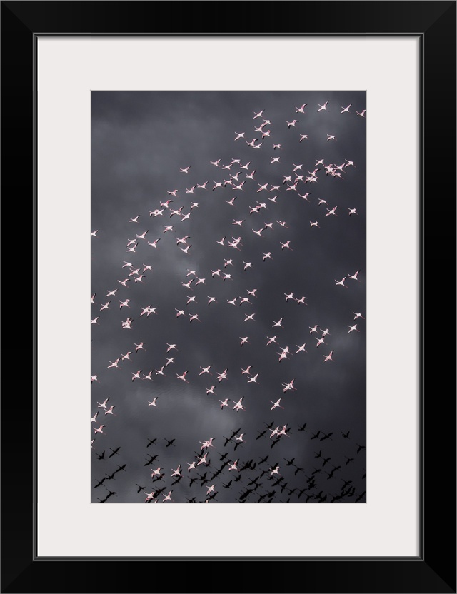<p>Africa, Tanzania, aerial view of flock of greater and lesser flamingos flying above salt waters of lake Natron.</p>