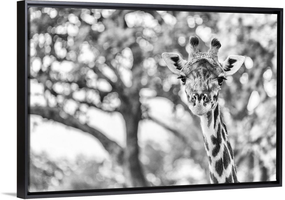 <p>Africa, Tanzania, Katavi National Park. Black and white portrait of a female giraffe.</p>