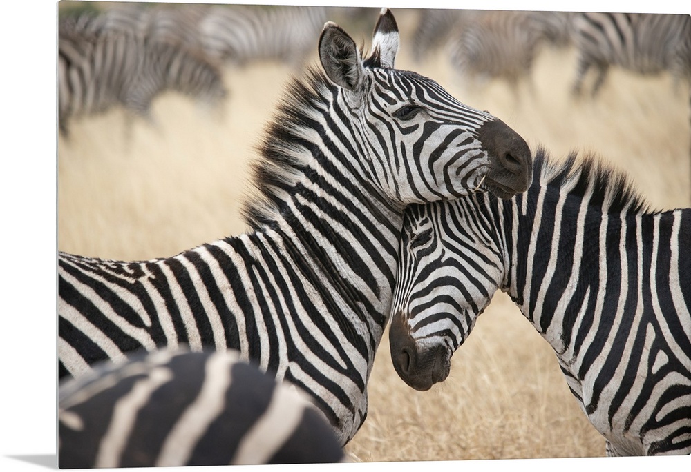 <p>Africa, Tanzania. Loving zebras nuzzle in the Serengeti. Africa, Tanzania.</p>