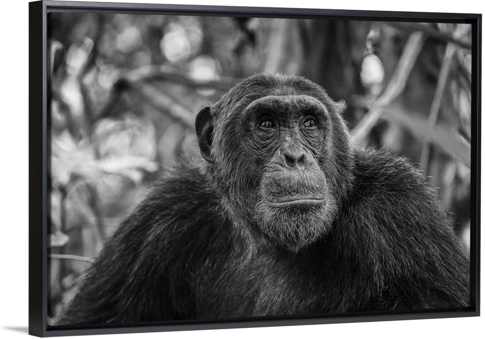 <p>Africa, Tanzania, Mahale Mountains National Park. A black and white portrait of a male chimpanzee.</p>