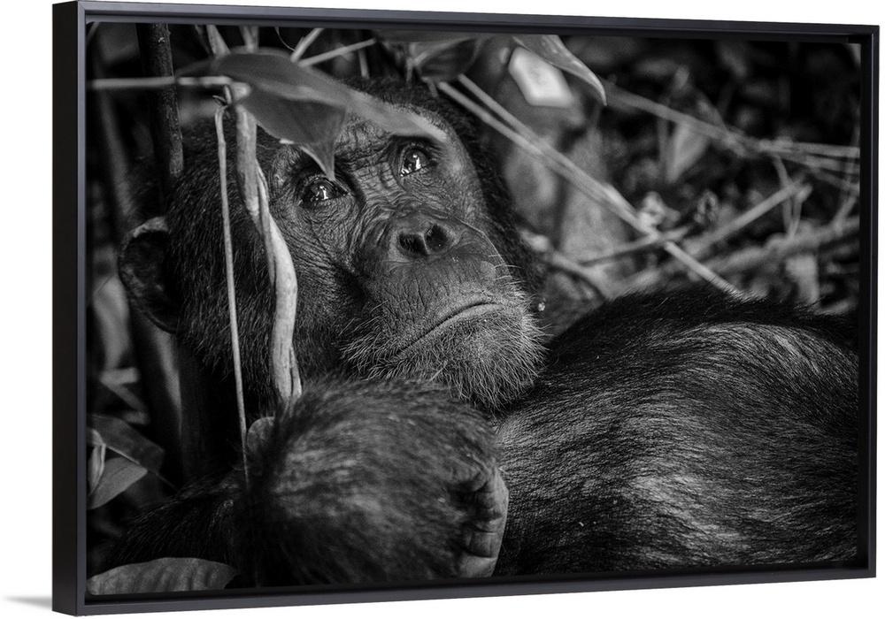 <p>Africa, Tanzania, Mahale Mountains National Park. A black and white portrait of a male chimpanzee.</p>