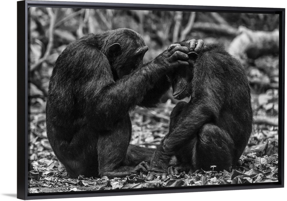 <p>Africa, Tanzania, Mahale Mountains National Park. Black and white picture of two chimps grooming.</p>