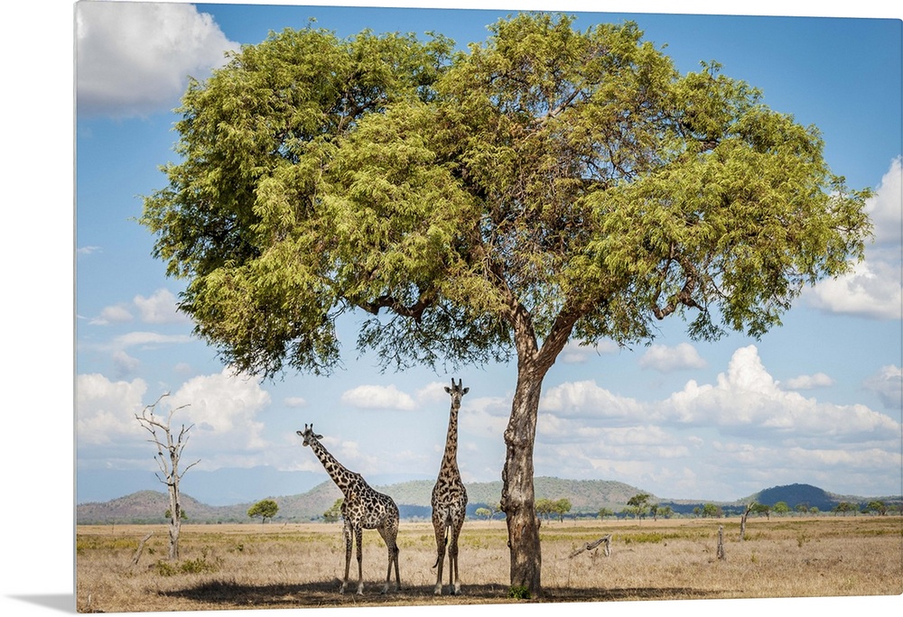 <p>Africa, Tanzania, Mikumi National Park. Giraffes under an acacia tree.</p>