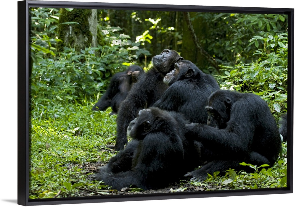 <p>Africa, Uganda, Kibale National Park, Ngogo Chimpanzee Project. Chimpanzee males are attracted to an estrous female resting high in the trees; some gaze up at her while others groom.</p>