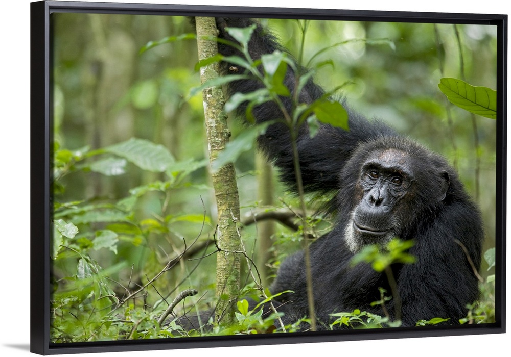 <p>Africa, Uganda, Kibale National Park, Ngogo Chimpanzee Project. A wild male chimpanzee stares, his face relaxed.--</p>