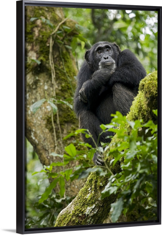 <p>Africa, Uganda, Kibale National Park, Ngogo Chimpanzee Project. A relaxed female chimpanzee sits aloft in a mossy tree looking intently.-</p>