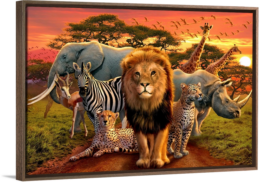 <p>Large illustration of a lion, zebra, elephant, rhinoceros, gazelle, cheetahs, giraffes and birds as they occupy the plains of Africa filled with acacia trees during a sunset.</p>