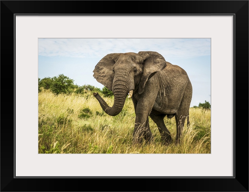 <p>Male African bush elephant (Loxodonta african) walks through grass, Cottar's 1920s Safari Camp, Maasai Mara National Reserve; Kenya</p>