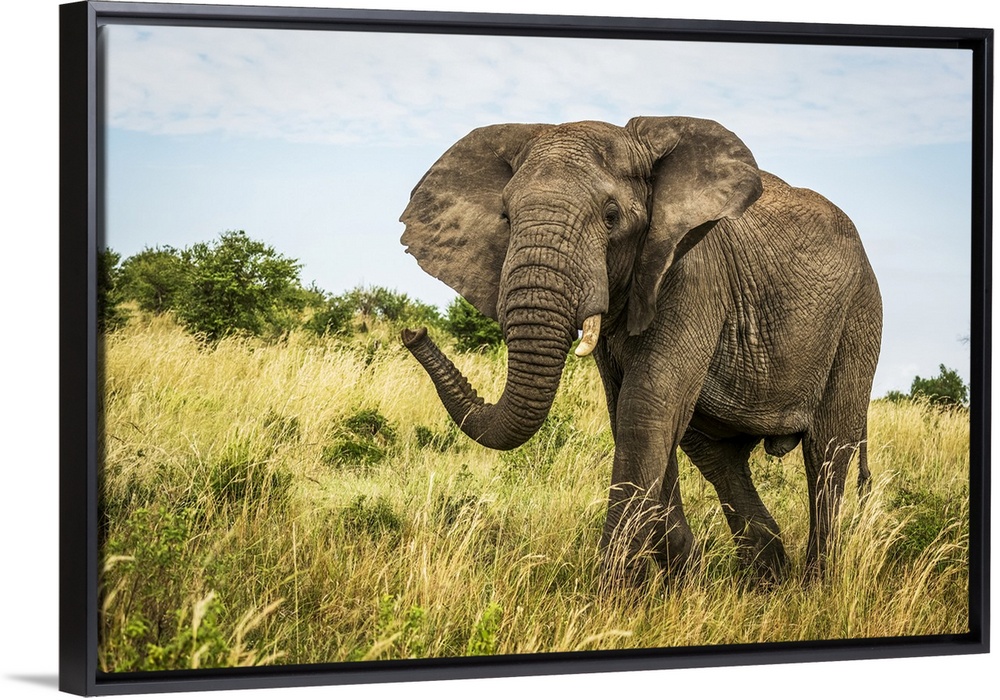 <p>Male African bush elephant (Loxodonta african) walks through grass, Cottar's 1920s Safari Camp, Maasai Mara National Reserve; Kenya</p>