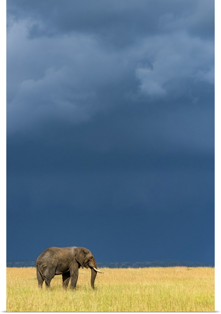 <p>African bush elephant (Loxodonta africana) stands in grass beneath dark clouds, Serengeti National Park; Tanzania</p>