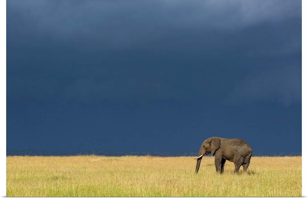 <p>African bush elephant (Loxodonta africana) stands in grass beneath dark clouds, Serengeti National Park; Tanzania</p>