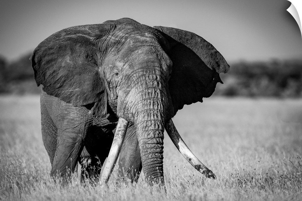 <p>Monochrome of African bush elephant (loxodonta africana) standing in grass, Grumeti Serengeti tented camp, Serengeti national park, Tanzania.</p>