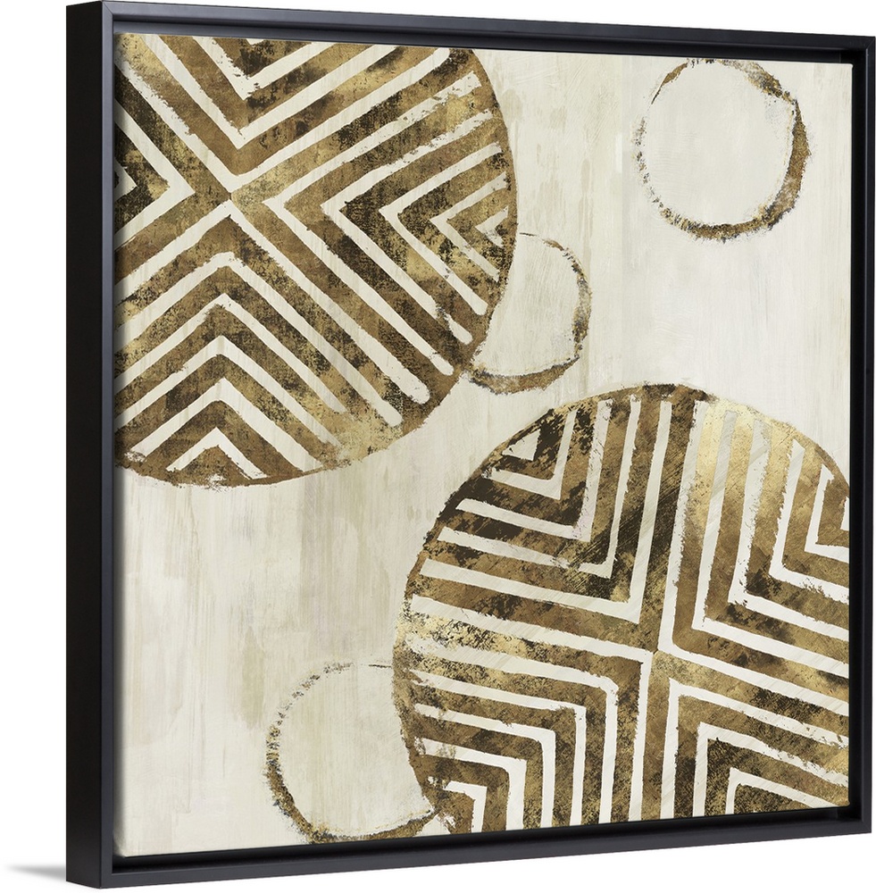 <p>Abstract art with metallic gold geometric circular shapes with lined designs on a light gold and white streaked square background.</p>