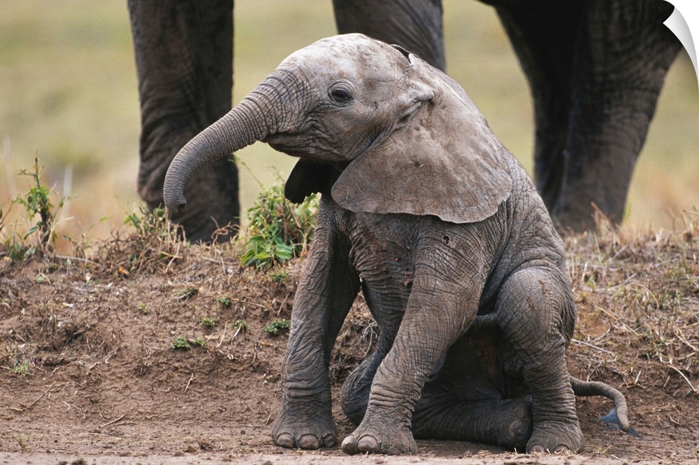 <p>African elephant calf (Loxodonta africana) sitting and watching, Masai Mara N.R, Kenya</p>