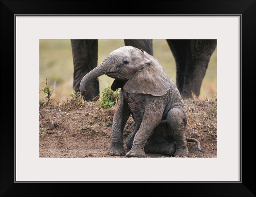 <p>African elephant calf (Loxodonta africana) sitting and watching, Masai Mara N.R, Kenya</p>