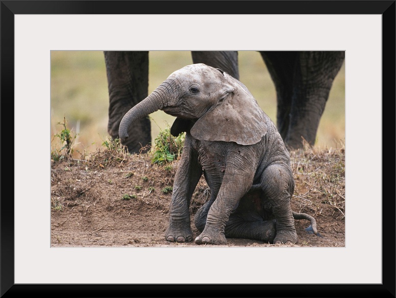 <p>African elephant calf (Loxodonta africana) sitting and watching, Masai Mara N.R, Kenya</p>