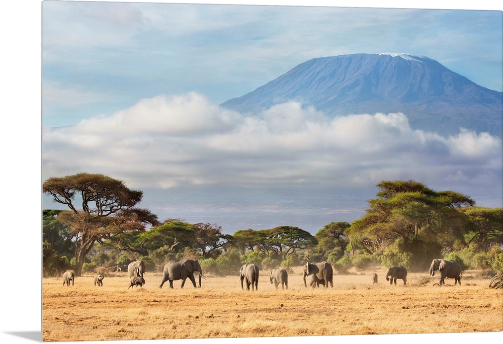 <p>African Elephant (Loxodonta africana) herd in savanna, Mount Kilimanjaro, Amboseli National Park, Kenya.</p>