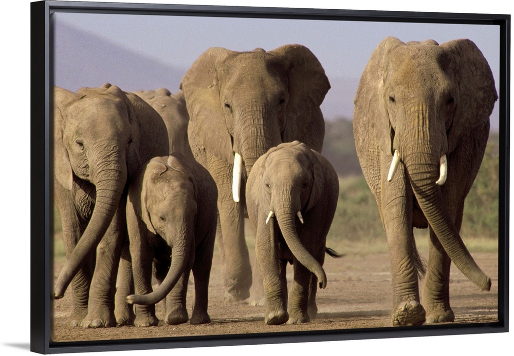 <p>Photo of six elephants walking together in an African park printed on canvas.</p>