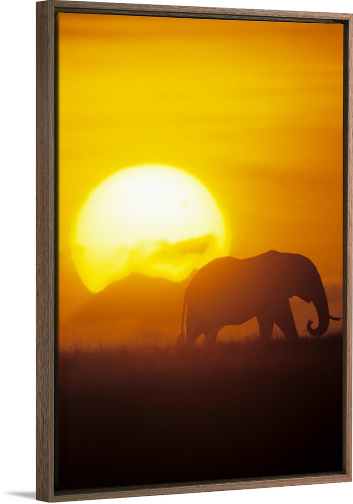 <p>Vertical photo on canvas of the silohuete of an elephant walking through a field with a large sun in the distance.</p>