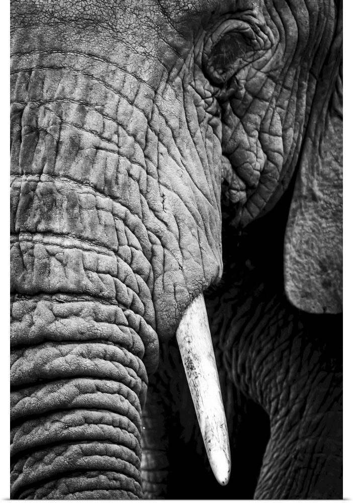 <p>An African elephant (loxodonta africana) stares at the camera, showing its wrinkled skin, long trunk and left eye and tusk, ngorongoro crater, Tanzania.</p>