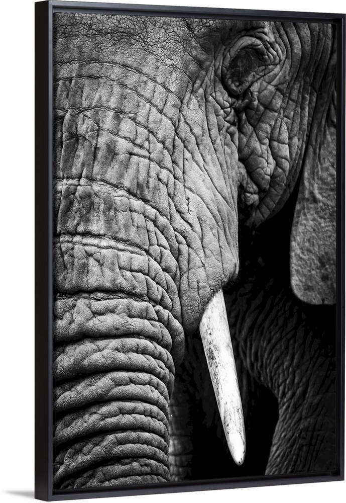 <p>An African elephant (loxodonta africana) stares at the camera, showing its wrinkled skin, long trunk and left eye and tusk, ngorongoro crater, Tanzania.</p>