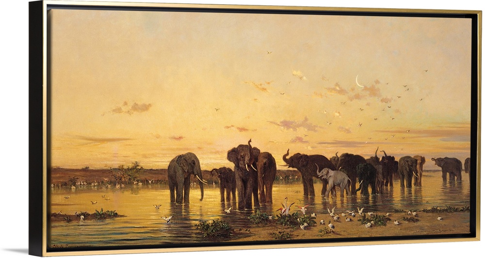 <p>An oil painting of elephants at dusk standing in shallow water with birds scattered throughout the air and on the ground.</p>