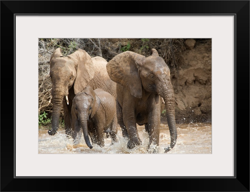 <p>Wall docor of three elephants having fun and splashing in water in African.</p>