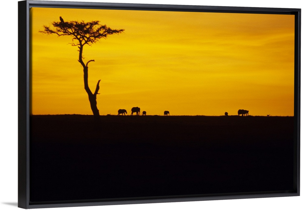<p>African elephants silhouetted at dawn, Kenya, Africa</p>