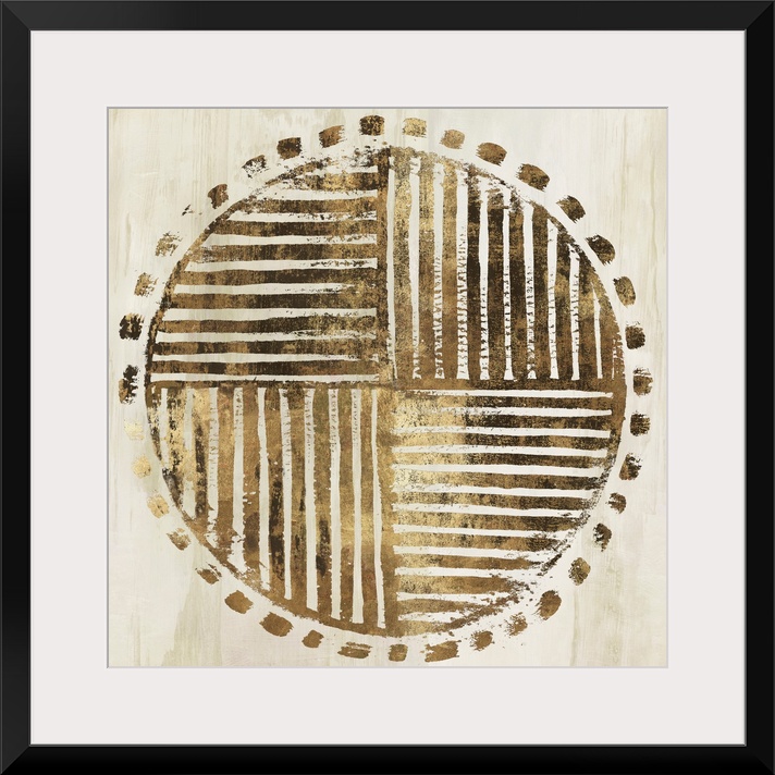 <p>Abstract decor with a large circular shape filled in with a decorative lined design on a square background made with light gold and white streaks.</p>