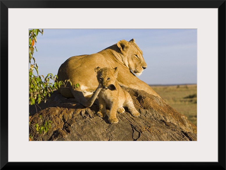 <p>A lioness snoozes on a rock in the sun while her offspring gnaws on her tail and stares at the camera; adorable baby animal wall art would look wonderful in a nursery or childos room.</p>