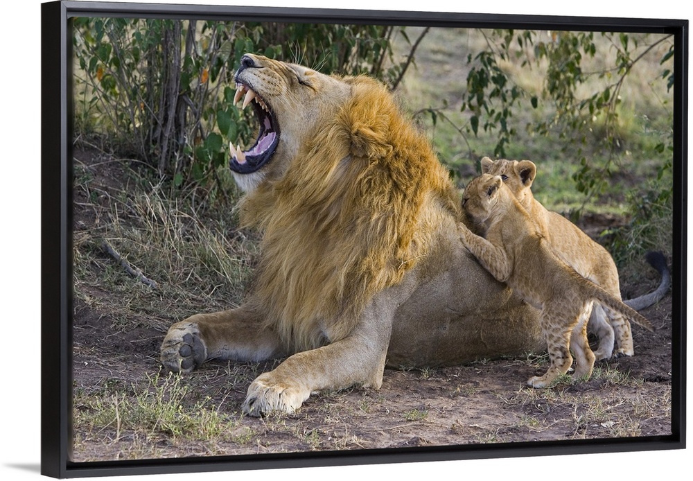 <p>African Lion (Panthera leo) seven to eight week old cubs playing with adult male, vulnerable, Masai Mara National Reserve, Kenya</p>