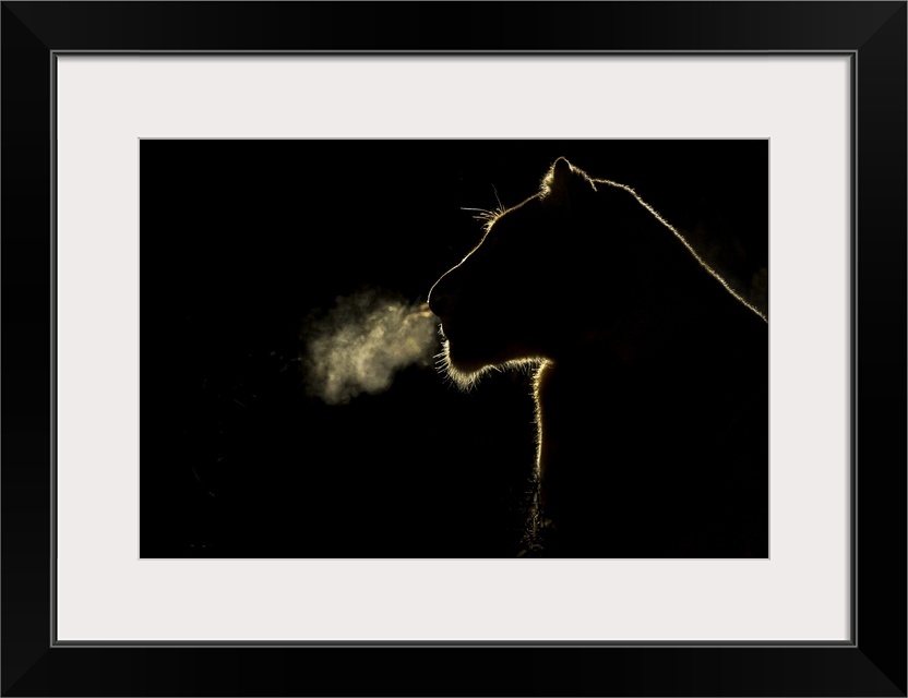 <p>African Lion (Panthera leo) lioness breathing at night, Sabi Sands Game Reserve, South Africa.</p>
