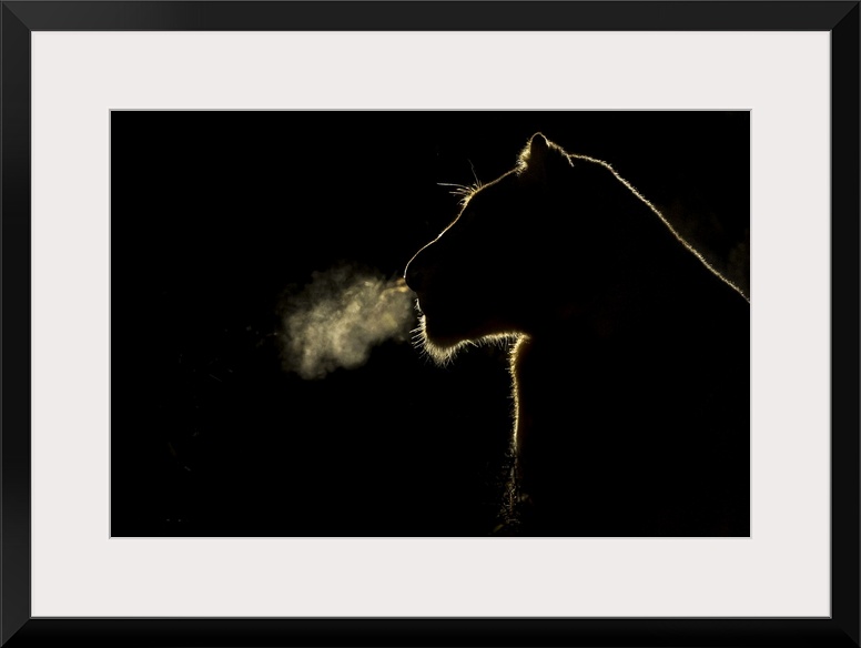 <p>African Lion (Panthera leo) lioness breathing at night, Sabi Sands Game Reserve, South Africa.</p>