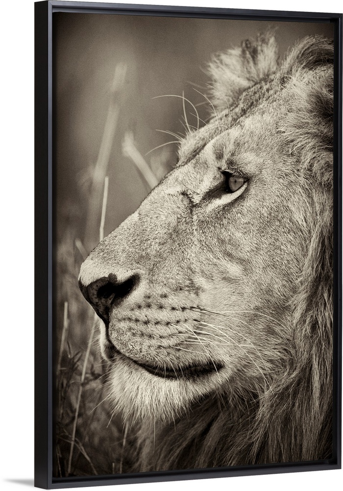 <p>A large vertical black and white photograph of a proud adult male lion with a mane staring off into the distance.</p>