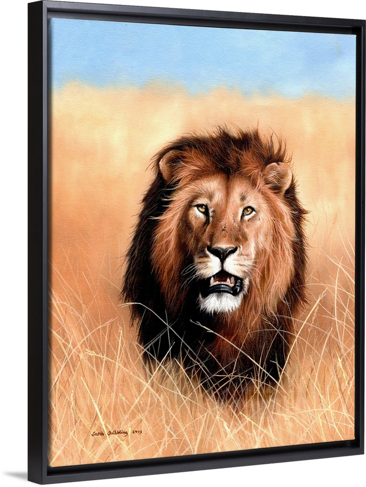 <p>Oil painting of an African lion in the savannah.</p>