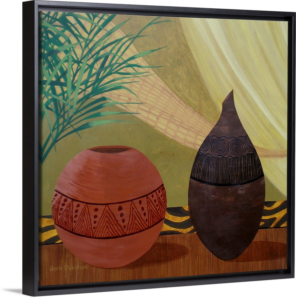 <p>Square still life painting of two African pots with lined designs.</p>