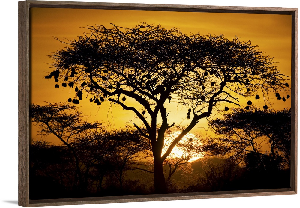 <p>Large, landscape photograph of a tree and bushes of an African landscape, silhouetted by the setting sun in the background.</p>