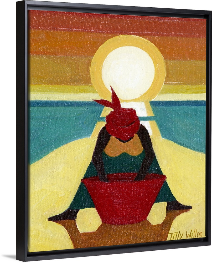<p>Oversized vertical painting of an African American woman bent over with her hands in a wash tub, her back to the large, blazing sun as it begins to set on the horizon.</p>