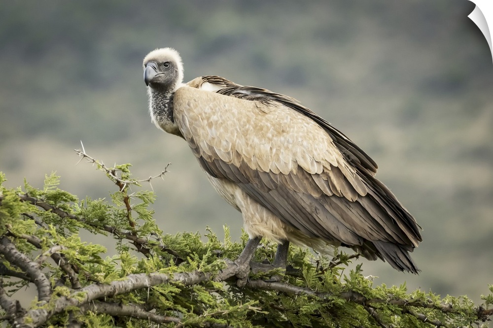 <p>African white-backed vulture (gyps africanus) atop tree looking down, Serengeti, Tanzania.</p>