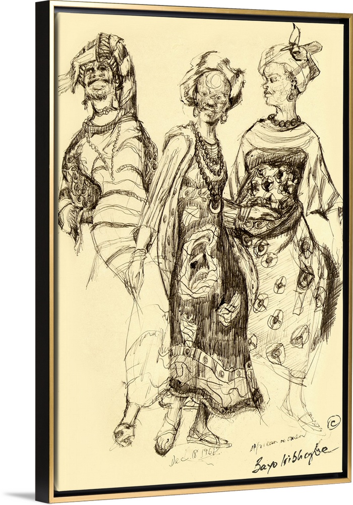 <p>Graphite illustration of three ladies in traditional African garb, including beaded jewelry and patterned dresses.</p>