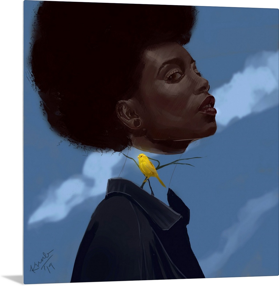 <p>Surrealist painting of a canary on a woman's neck.</p>