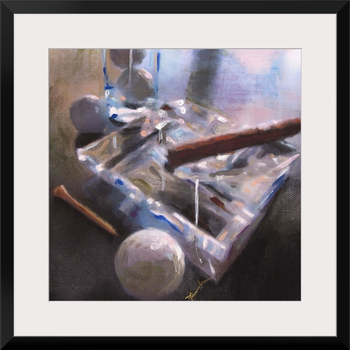 <p>Contemporary painting of a large glass ashtray with a cigar resting in it and a golf ball and tee beside the ashtray.</p>
